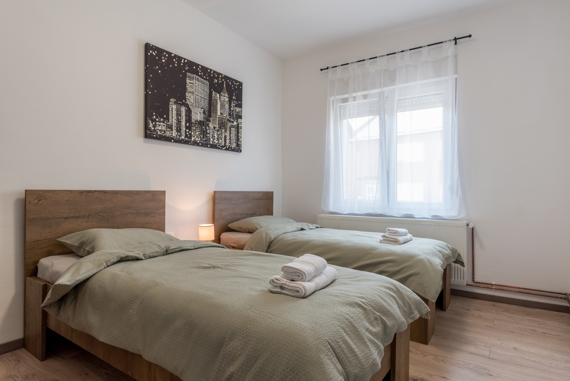 Nalazi se u centru grada, 5 minuta pješke do: tržnice, glavnog trga, vodotornja, Dunava, restorana..